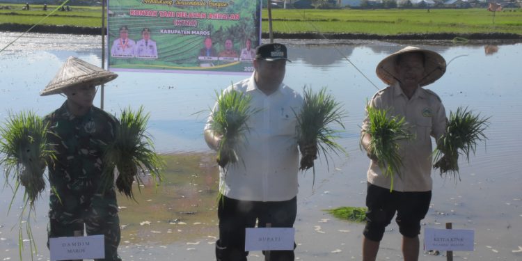 MAROS — Bupati Maros, Dr. H.A.S. Chaidir Syam, S.IP., M.H bersama jajaran terkait melaksanakan kegiatan tanam padi serentak Musim Tanam...